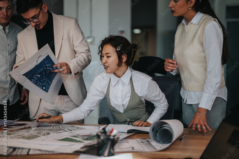 A diverse group of business people collaborates on a project, reviewing documents and sharing innovative ideas in a modern office setting. The teamwork and focus are evident in their interaction.