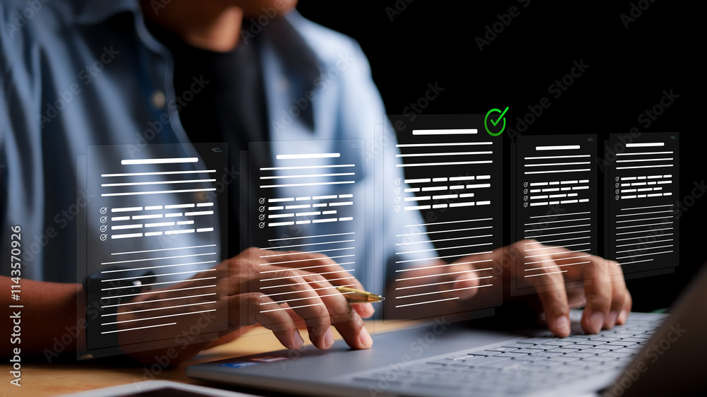 Businessman Take an assessment, Check list, questionnaire, evaluation, filling out an online survey form. Answer the test questions. online survey exam Choosing the right answer in the exam,