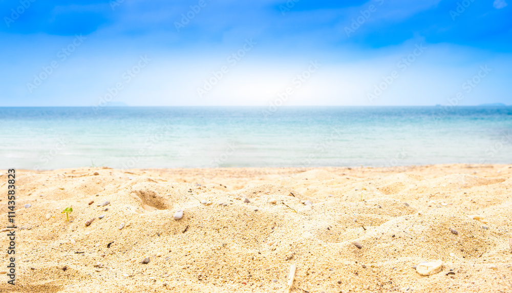 Nature of the beach and sea Summer with sunshine, sandy beaches, clear blue waters sparkling against the blue sky. On an island with good ecology and environment Background for summer vacation concept