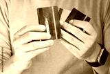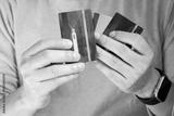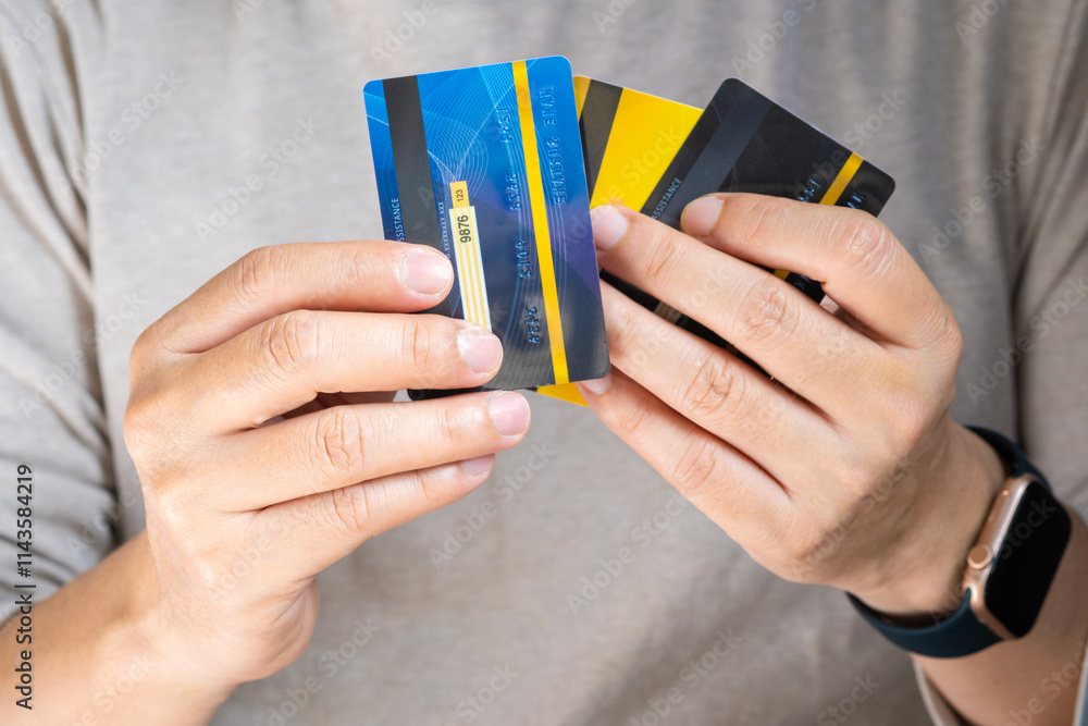 Man holding credit cards and he is choosing a credit card to pay and spend Payment for goods via credit card. Finance and banking concept