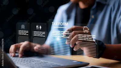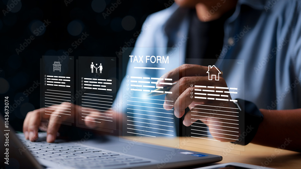 Man using a laptop with TAX REFUND and refund tax of duty taxation business, graphs and chart being demonstrated on the screen media, tablet pc and selecting tax refund, Saving tax for business