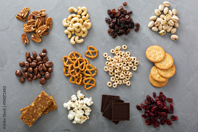 Variety of healthy snacks overhead shot