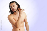 A young man with curly hair grooming his beard using an electric trimmer