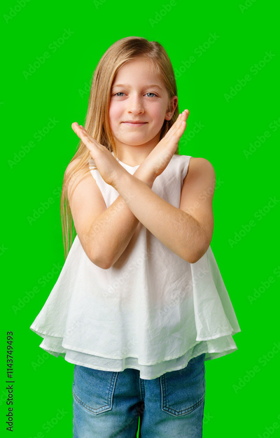 Young girl with long hair making a cross gesture in front of a bright green background