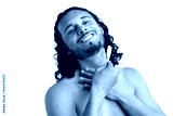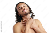 A man with curly hair grooming his beard in a well-lit space while using a straight razor