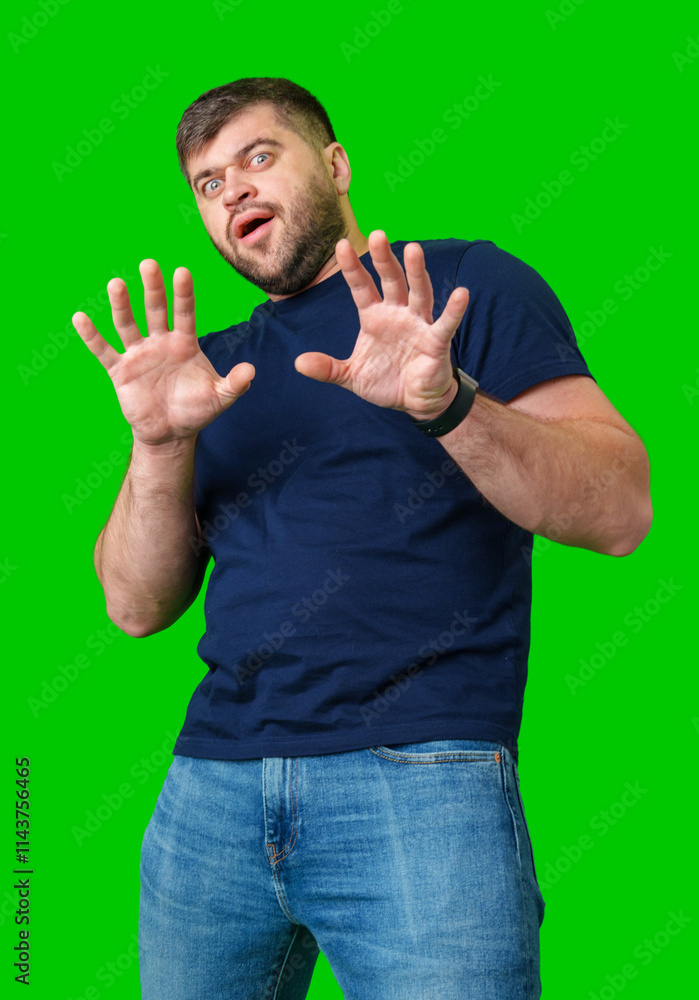 A man with a serious expression holds up both hands in a stopping gesture against a bright green background
