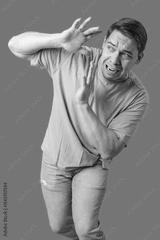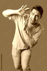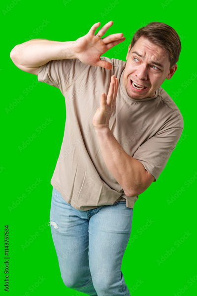 Man expressing fear while standing against a bright green background
