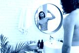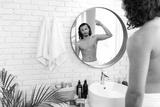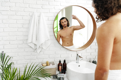 Man applying fragrance while looking in a round mirror in a bright bathroom