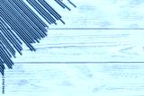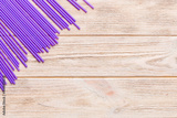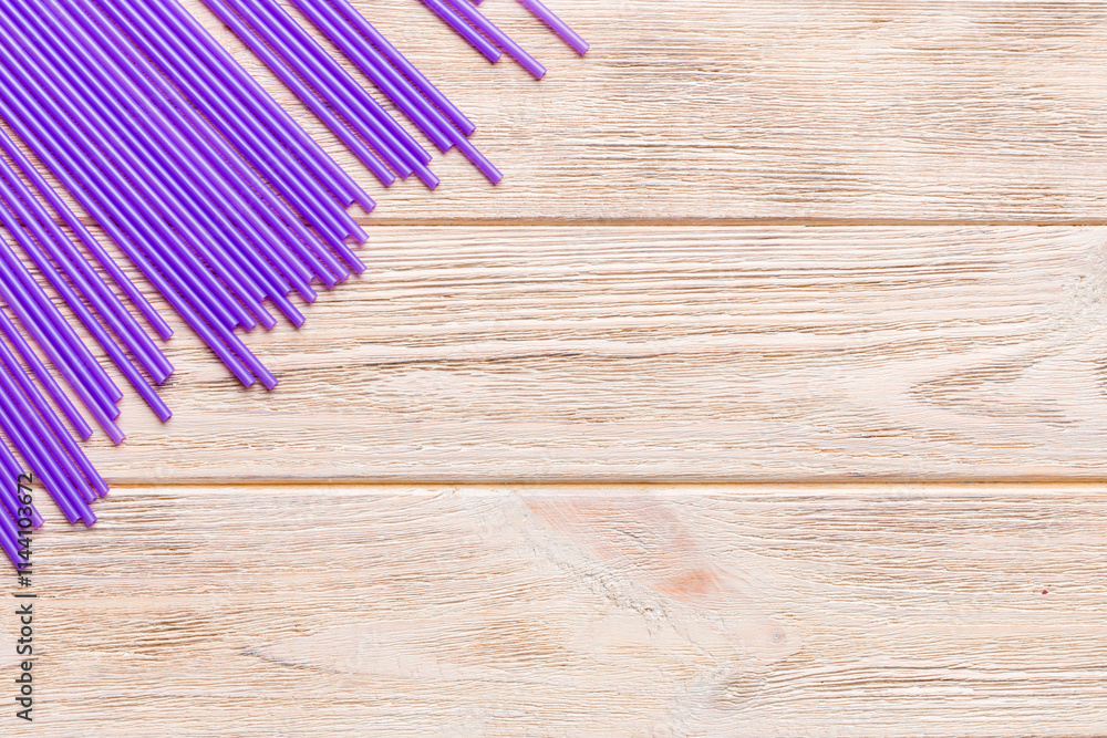 Heap of colorful plastic drinking straws on Colored background, flat lay. Copy Space for text