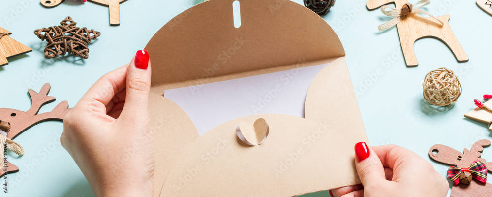 Top view of woman holding an envelope on blue background made of holiday decorations. Christmas time concept