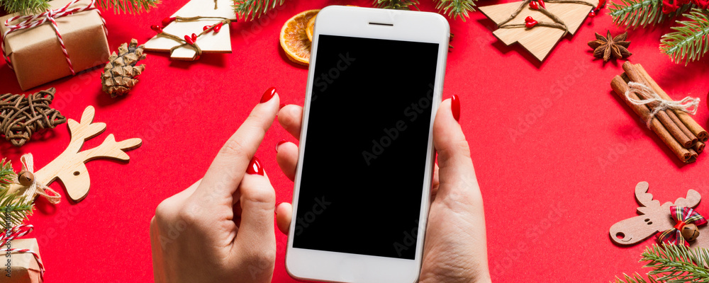 Top view of phone in female hand on festive red background. Christmas decorations. New Year time holiday. Mockup