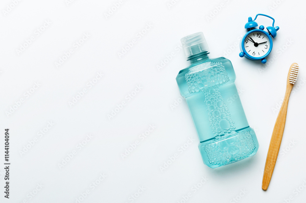 Mouthwash and other oral hygiene products on colored table top view with copy space. Flat lay. Dental hygiene. Oral care products and space for text on light background. concept