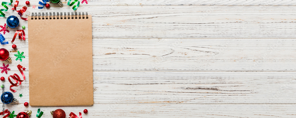 Christmas blank greeting card mock-up scene. Creative layout made of Christmas toy and paper card note. Flat lay. Nature New Year concept