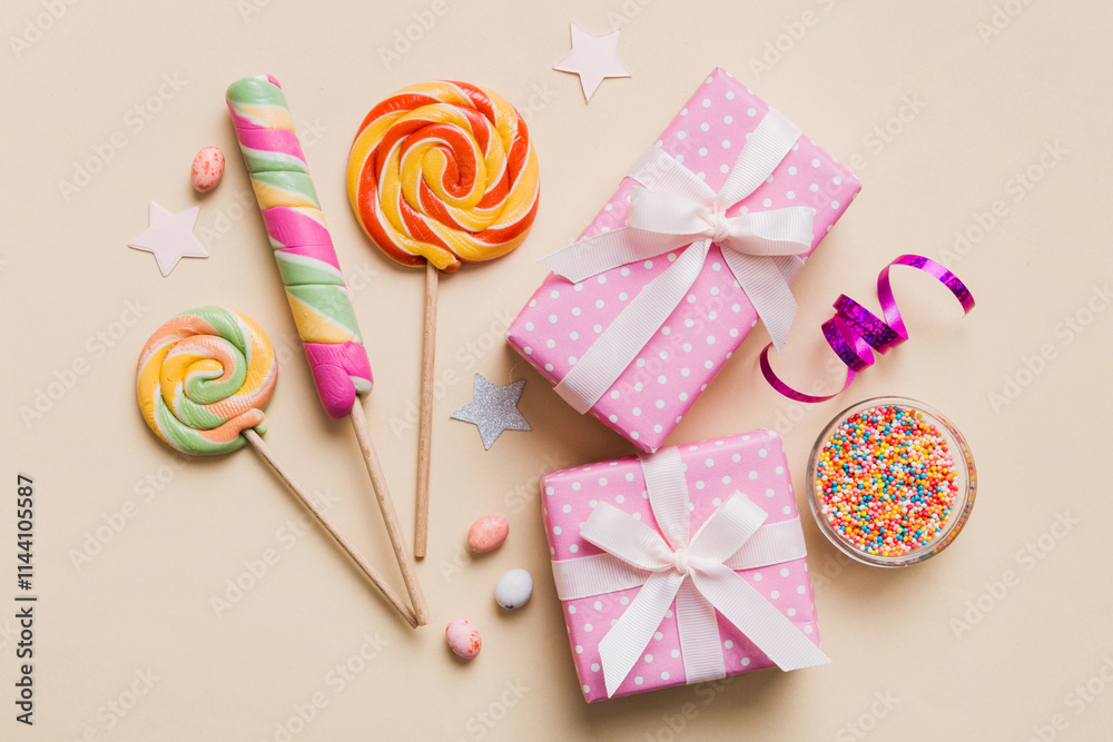 Collection of birthday party objects with gift box. Valentines day gift box. Top view flat lay with copy space