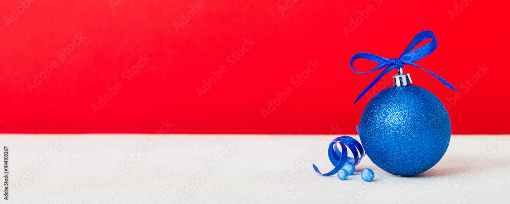 Christmas ball on colored background. decoration bauble with ribbon bow with copy space