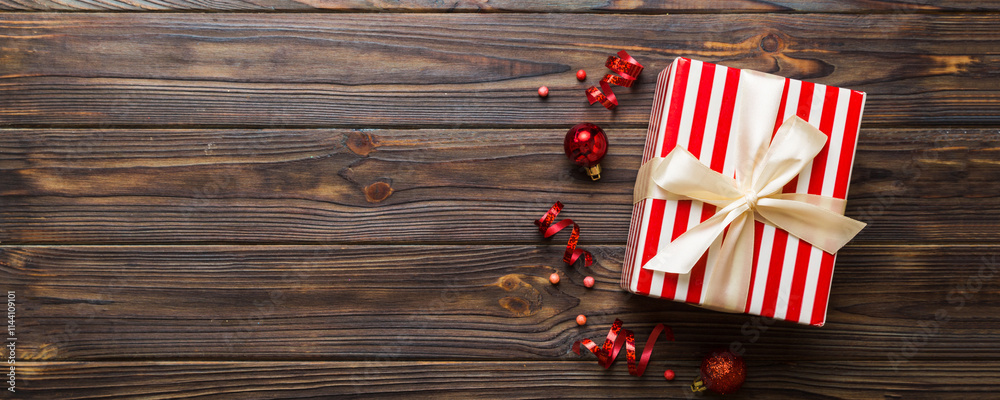 Top view Flat lay Christmas decorations and gift box on colored background with copy space. Christmas or Happy New Year composition