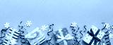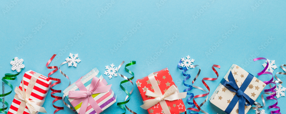 Holiday flat lay with gift boxes wrapped in colorful paper and tied decorated with confetti on colored background. Christmas, Birthday, Valentine and sale concept, top view