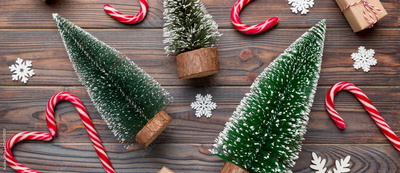Flat lay composition with christmas trees on color background. Top view with copy space