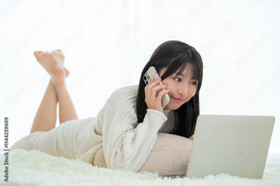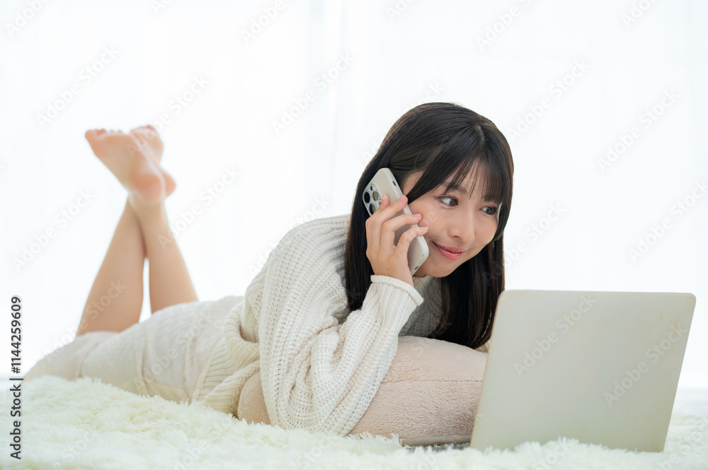 うつ伏せで電話をかける女性