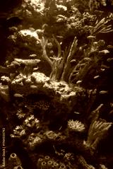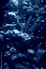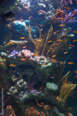 Aquarium with tropical fish and coral reef in sunlight