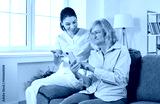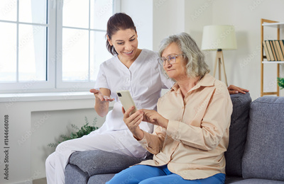 Caregiver assists an elderly woman with mobile phone and online technology at a nursing home. Nurse offers support with internet usage, ensuring the patient access to modern communication tools.