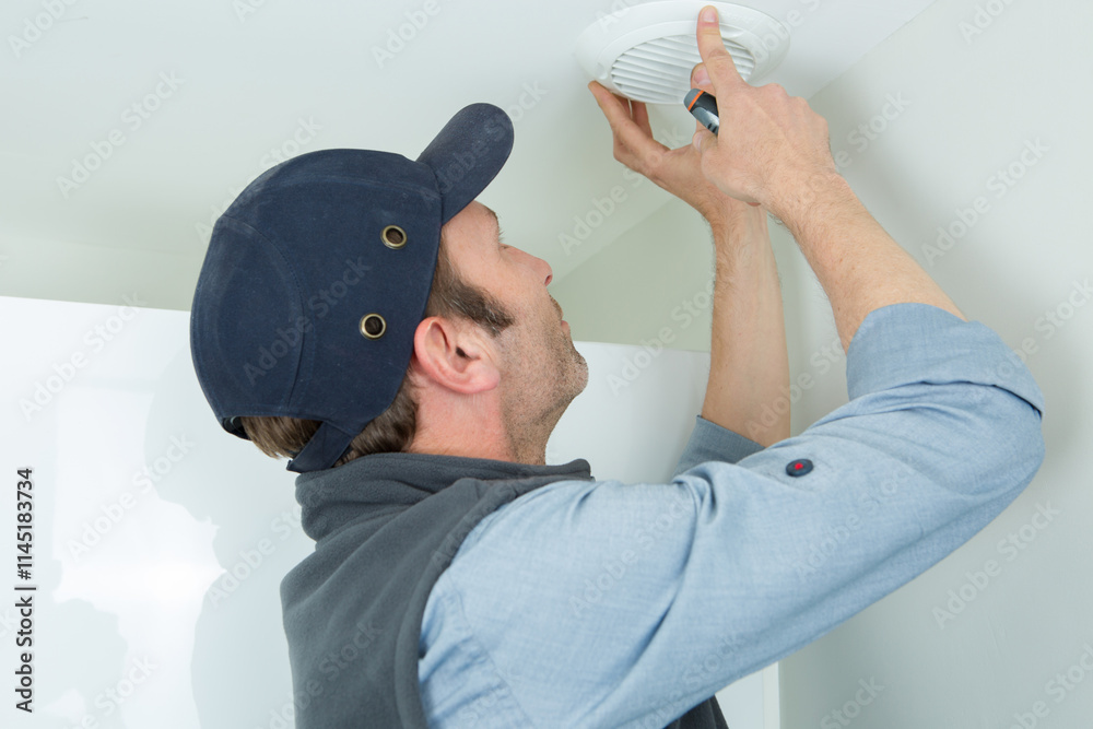 technician installing smoke detector on ceiling wall