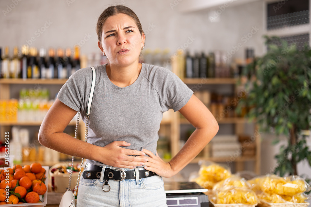 Young woman fidgeting by the stomach in the store. European woman felt unwell and indigestion in the supermarket.
