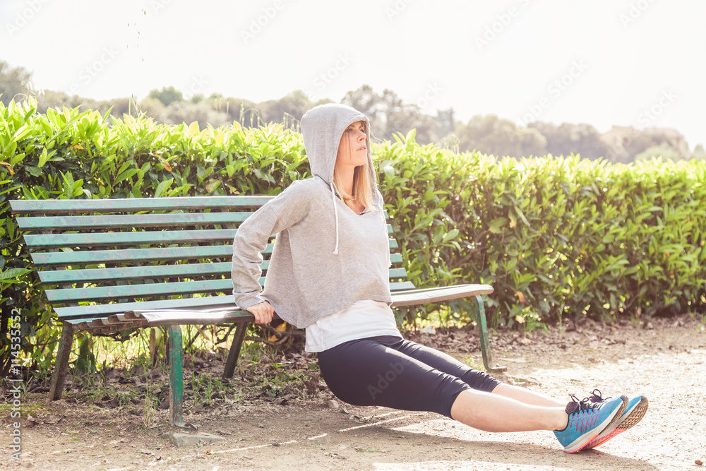 Young woman exercises at a bench in a sunny day, wearing a sweatshirt with a hood