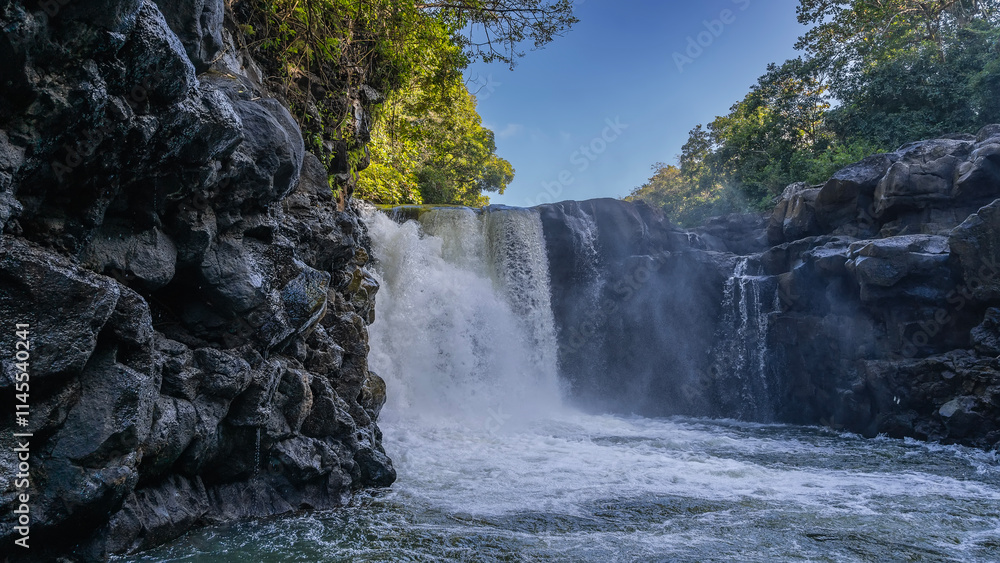 A beautiful tropical waterfall. Streams of water fall from the edge of the ledge into the river. Foam, splashes. Wet steep coastal cliffs. Green trees against a blue sky. Mauritius. GRSE waterfall
