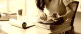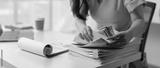 Young Asian woman looking happy with headphones around her neck Work on a laptop computer online business Communicate with video conferencing Take notes in a notebook Ideas at the work desk.