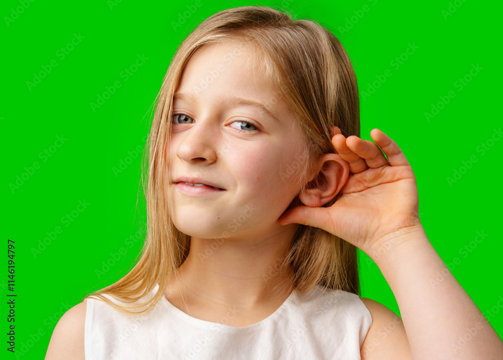 A young girl with long blonde hair cupping her hand to her ear against a bright green background