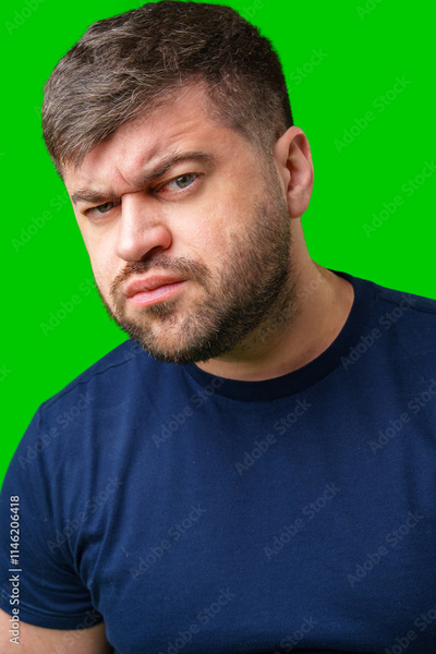 Man expressing confusion with crossed arms in front of a bright green background