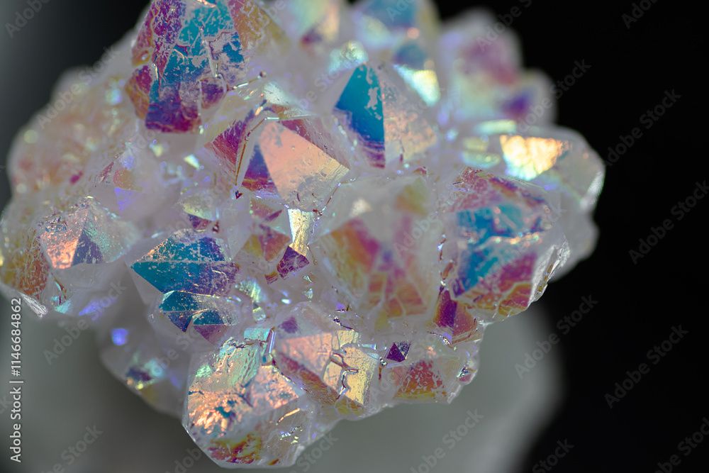 A rainbow aura quartz crystal cluster radiates vibrant, iridescent hues, combining natural beauty with mystical energy and gemstone brilliance, isolated in studio