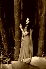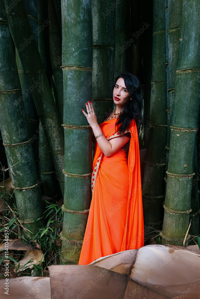 Beautiful woman in an orange sari on the bamboo background.