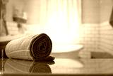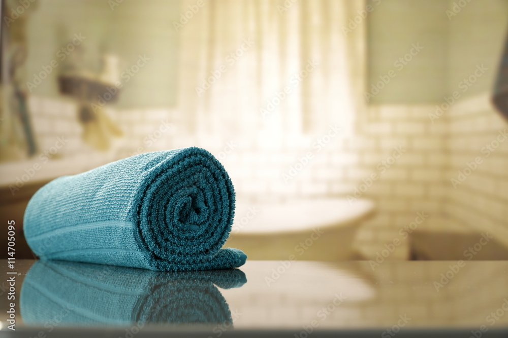 Bathroom counter with towels and product placement space – bright interior with white bathtub background.