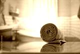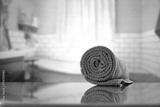 Bathroom counter with towels and product placement space – bright interior with white bathtub background.
