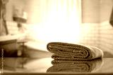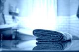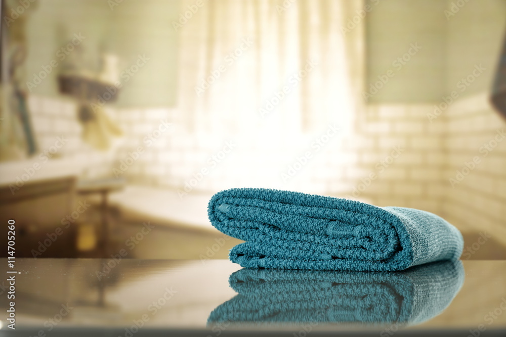 Bathroom counter with towels and product placement space – bright interior with white bathtub background.