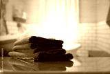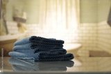Bathroom counter with towels and product placement space – bright interior with white bathtub background.