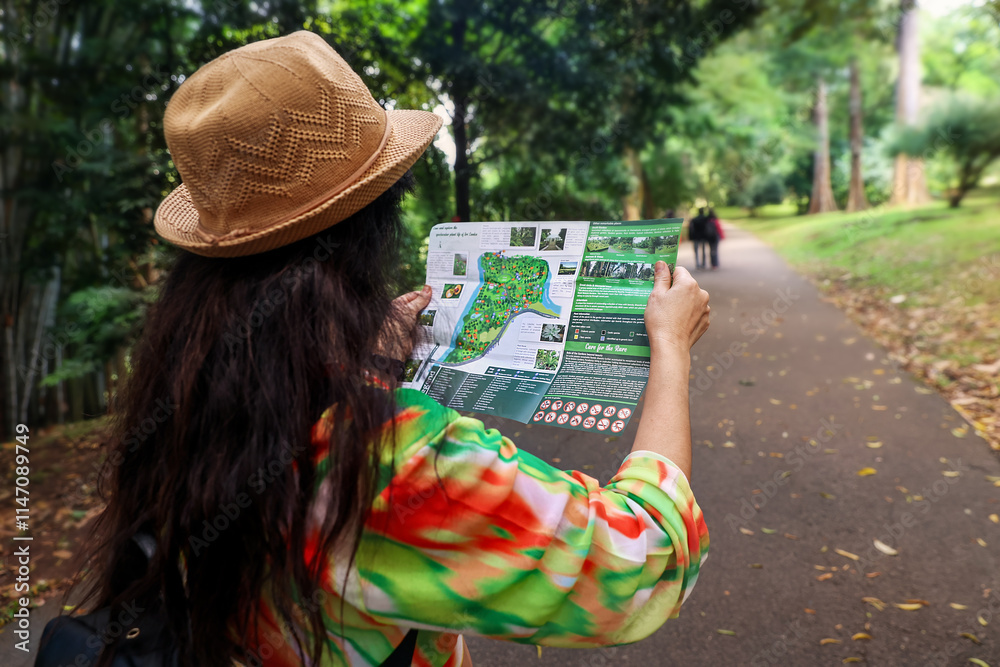 A tourist in a hat holds a map in her hands in a botanical garden. Sri Lanka