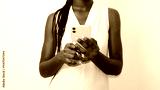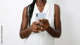 Young black African lady woman in white sleeveless blouse shirt holding in hand mobile cell phone surfing internet over white background.