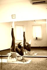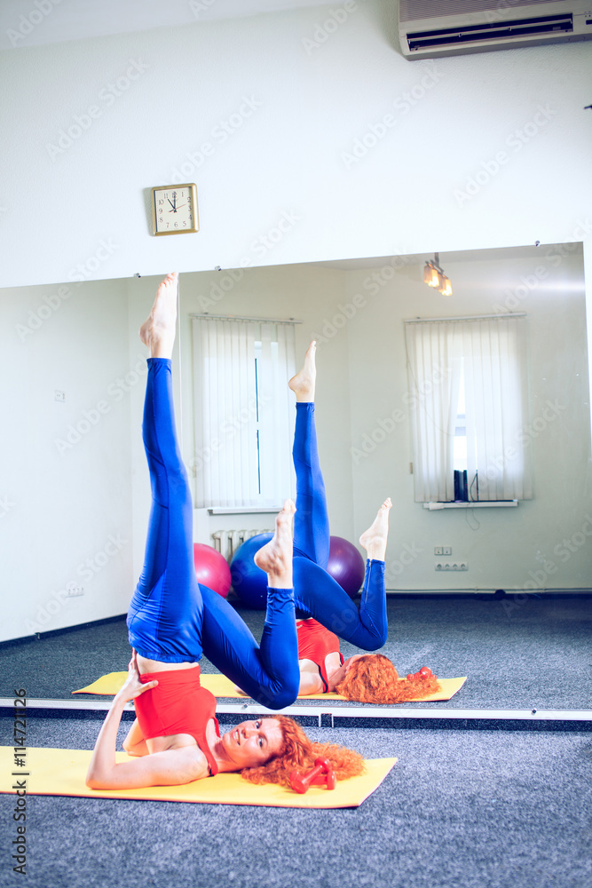 young female instructor doing pilates exercises in sport club