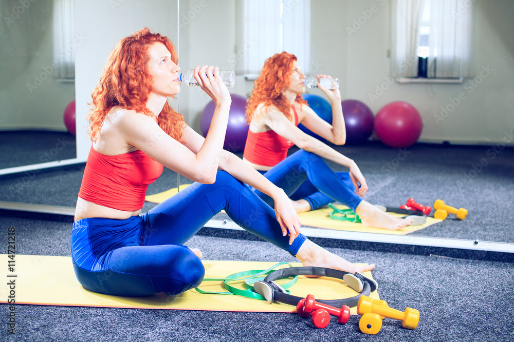 young female instructor doing pilates exercises in sport club
