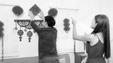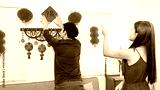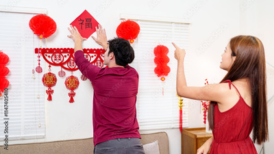 A couple decorates their living room for Chinese New Year, arranging red lanterns and festive ornaments, symbolizing prosperity and happiness