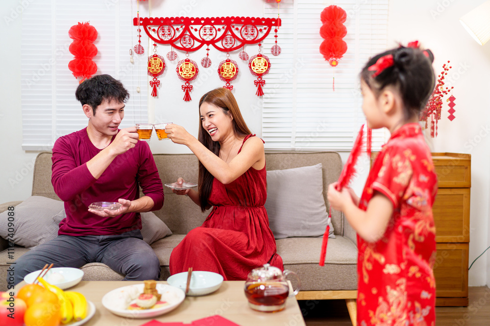 An Asian family enjoys pouring tea and spending quality time during Chinese New Year celebrations, creating a harmonious and joyful atmosphere at home