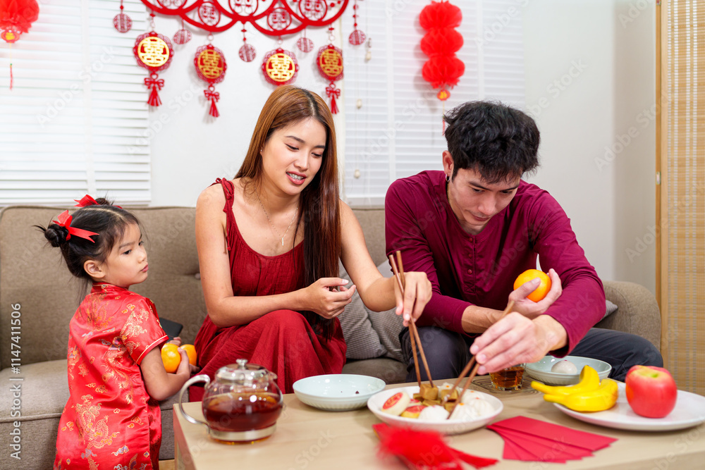 A Chinese family of three arranges a festive dining table to celebrate the Chinese New Year, highlighting cultural traditions and family bonding