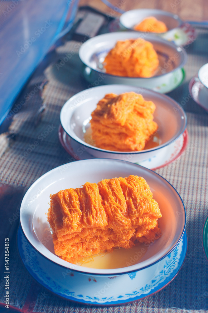 Beautiful delicious sweet Thai golden egg yolk strips in water boiled sweet sugar syrup in a bowl famous traditional culture Thai dessert served important celebrations, Golden threads, Foi Thong.
