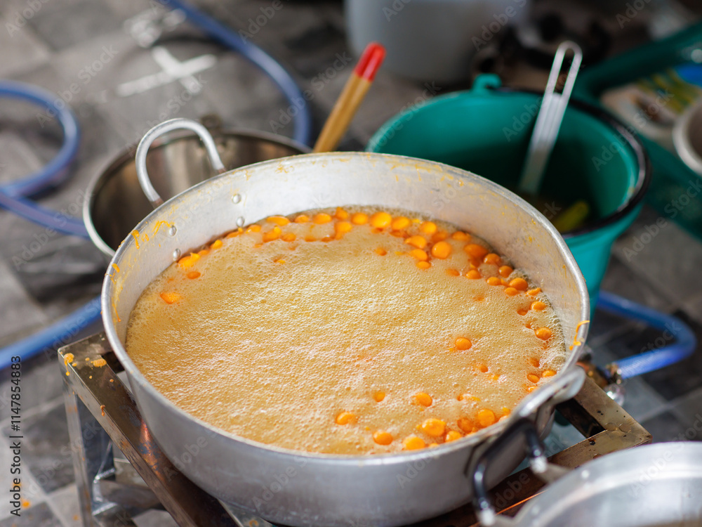 Making original golden Thai dessert process traditional culture production ingredient golden egg yolk in water boiled sweet sugar syrup, Golden drops,Thong Yod.