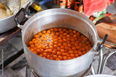 Making original golden Thai dessert process traditional culture production ingredient golden egg yolk in water sweet sugar syrup, Golden drops,Thong Yod.