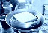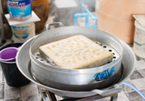 Ingredient of egg, coconut milk and sugar together on place in square container for steaming custard pudding Thai dessert name Sang Kaya famous local traditional culture served important celebrations.