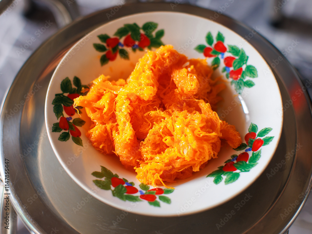Beautiful delicious sweet Thai golden egg yolk strips in water boiled sweet sugar syrup in a plate famous traditional culture Thai dessert served important celebrations, Golden threads, Foi Thong.
